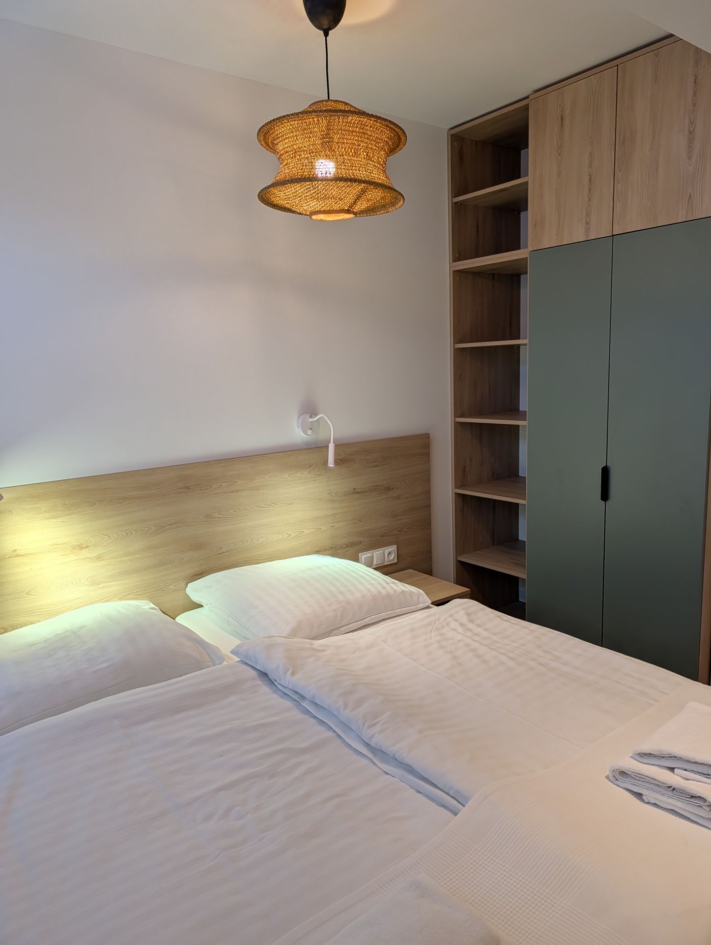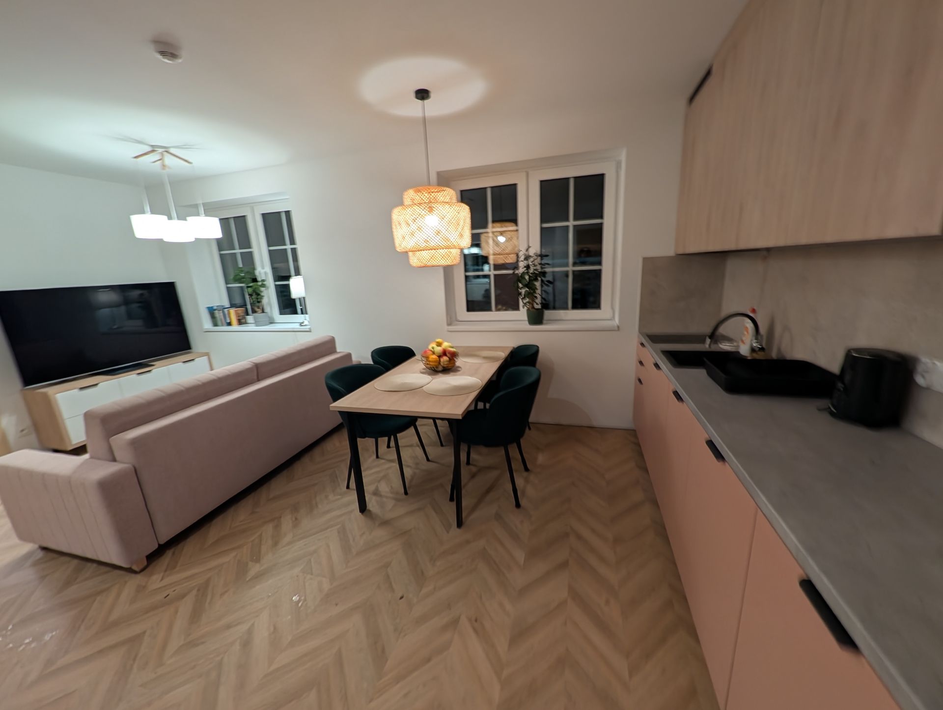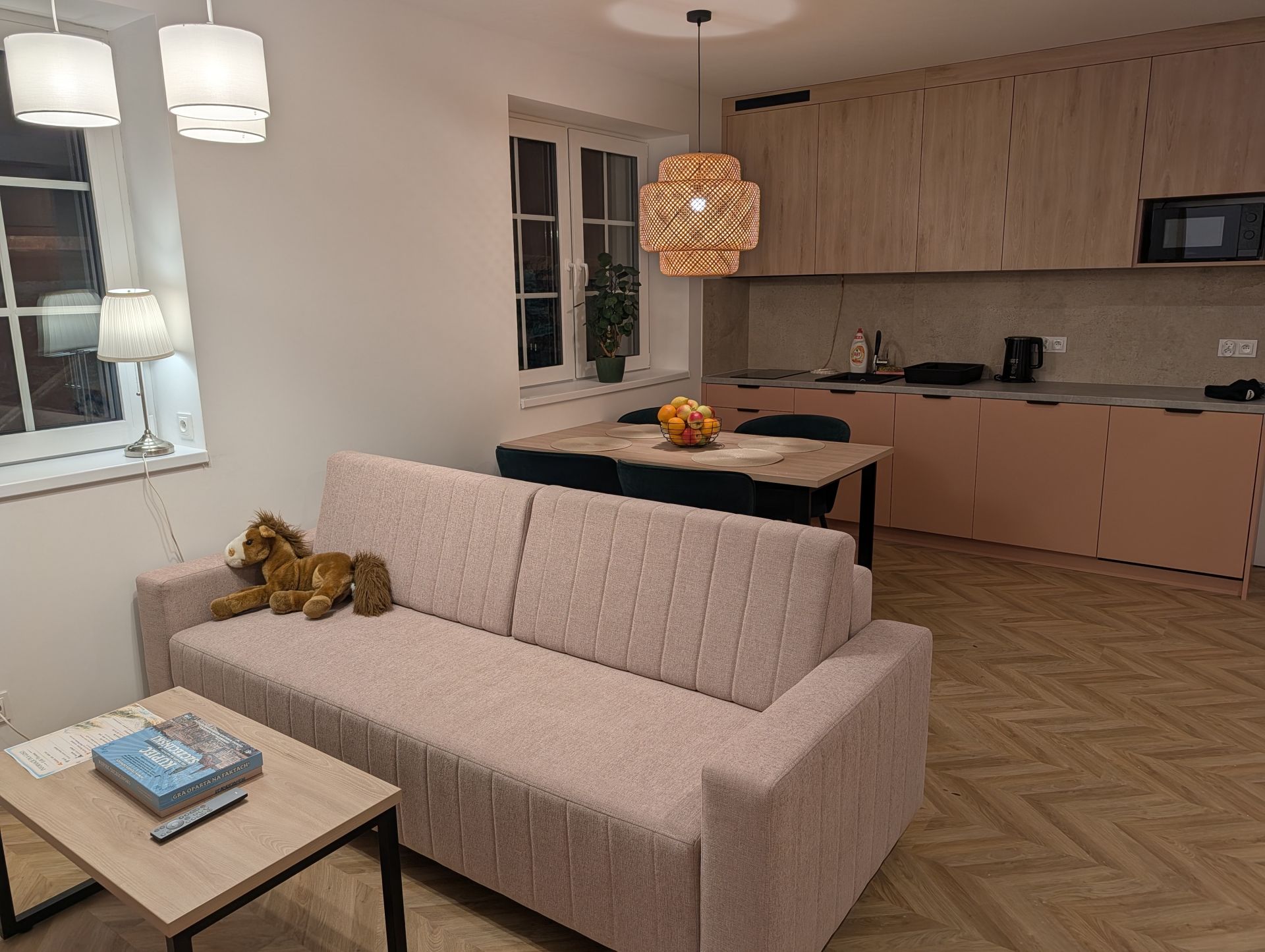 Piękny apartament o powierzchni 50m2, złożony z dwóch sypialni, dużego salonu z kuchnią (płyta indukcyjna, zmywarka, lodówka, kuchenka mikrofalowa, naczynia, talerze, sztućce, garnki - słowem wszelkie wyposażenie niezbędne by podczas wyjazdu wygodnie przygotować jedzenie.