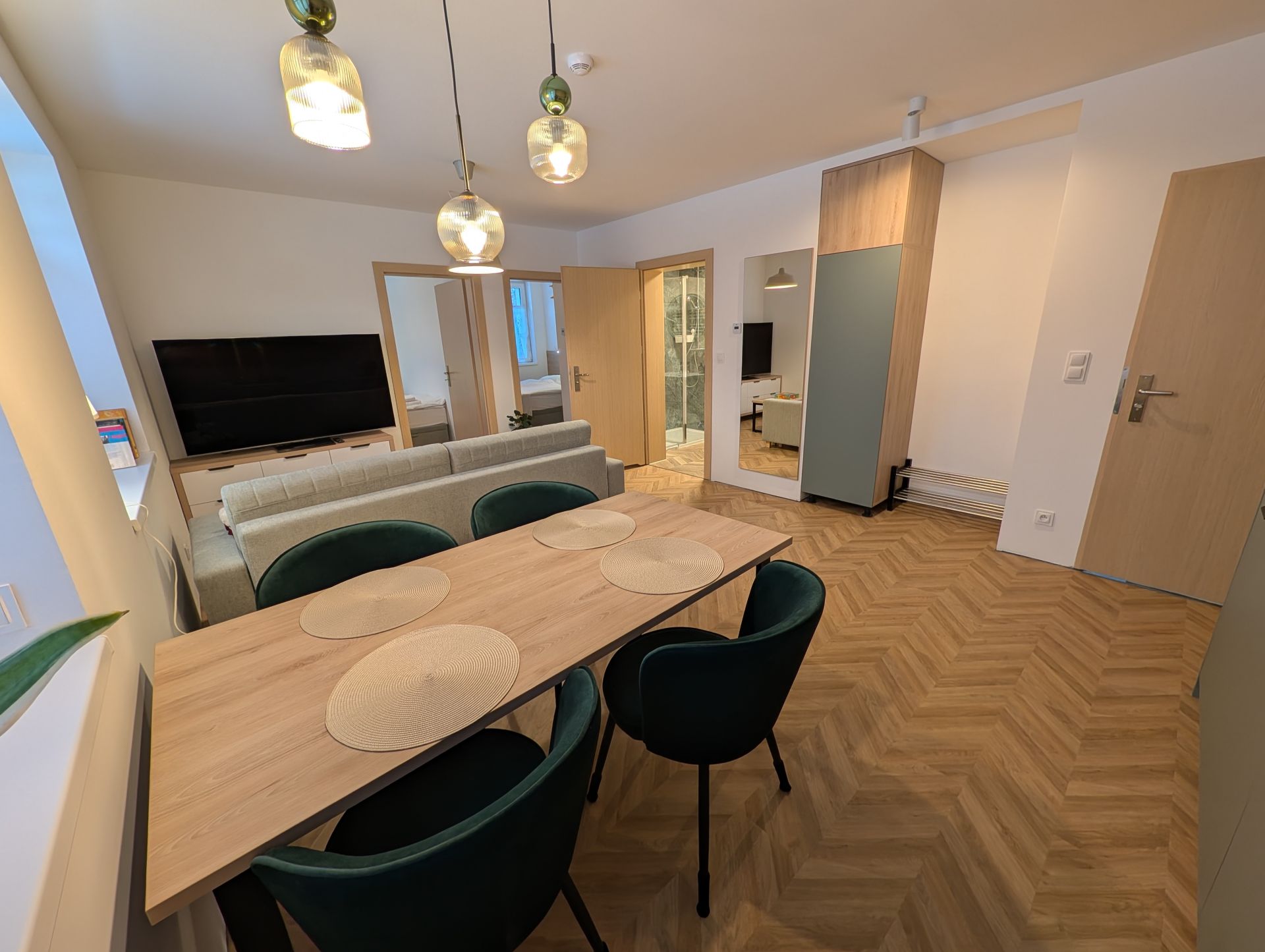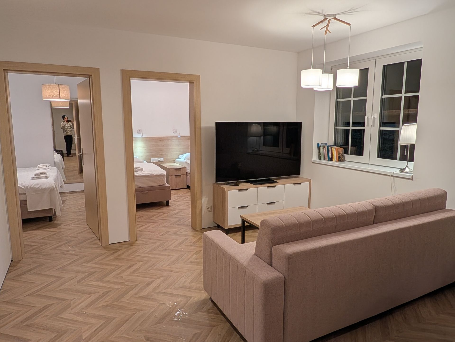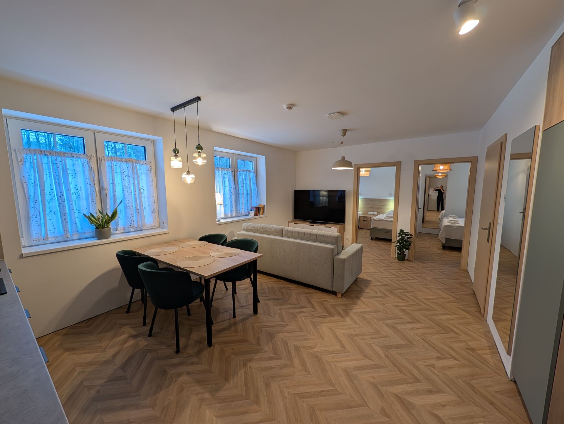 Piękny apartament o powierzchni 50m2, złożony z dwóch sypialni, dużego salonu z kuchnią (płyta indukcyjna, zmywarka, lodówka, kuchenka mikrofalowa, naczynia, talerze, sztućce, garnki - słowem wszelkie wyposażenie niezbędne by podczas wyjazdu wygodnie przygotować jedzenie.