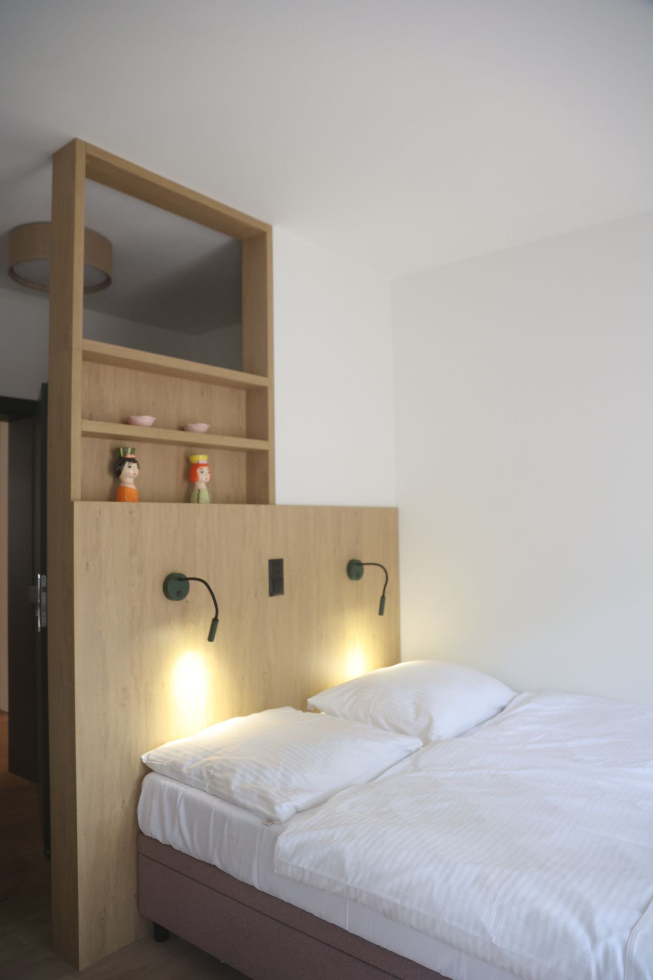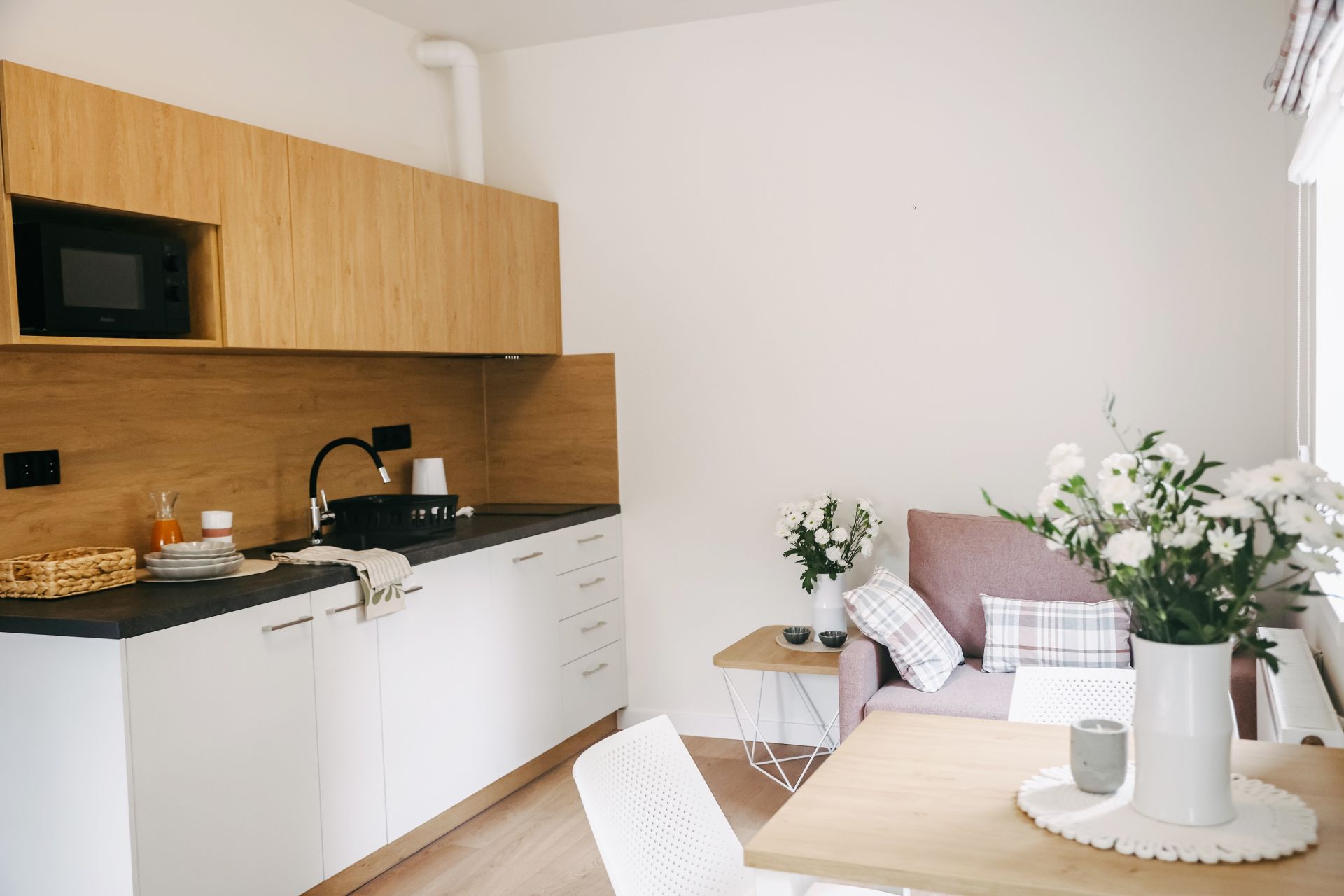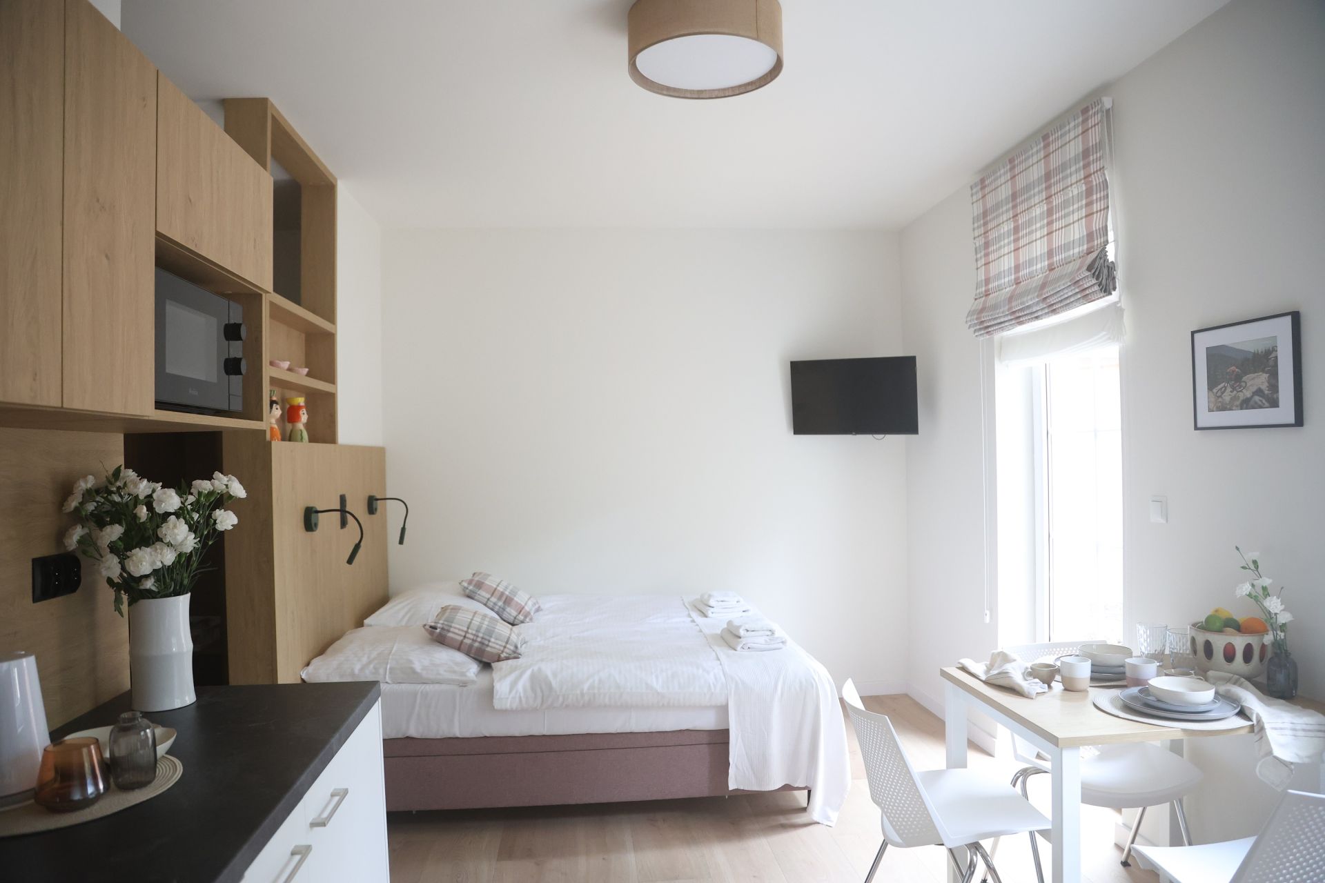 Nowoczesny, świeżo wyremontowany apartament z wygodnym łóżkiem małżeńskim i rozkładaną sofą jednoosobową. Idealny dla pary z dzieckiem lub trzech dorosłych osób. Apartament posiada aneks kuchenny wyposażony w płytę indukcyjną, zmywarkę, lodówkę, czajnik, mikrofalówkę oraz air fryer. W łazience: prysznic, WC, umywalka i suszarka do włosów.