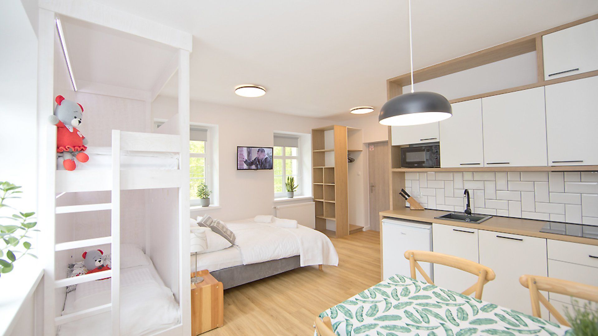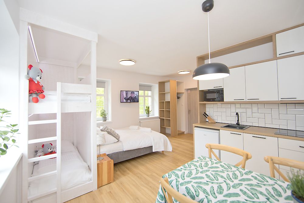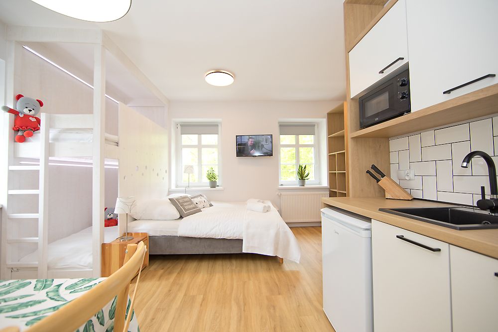 Funkcjonalny apartament idealny dla rodzin z dziećmi. W części głównej łóżko hotelowe (łączone lub osobne), a dla najmłodszych – zabudowana dwupoziomowa konstrukcja sypialna. W aneksie kuchennym: płyta indukcyjna, zmywarka, mikrofalówka, lodówka, zlew oraz komplet akcesoriów kuchennych. Łazienka z prysznicem, WC, umywalką i suszarką do włosów.